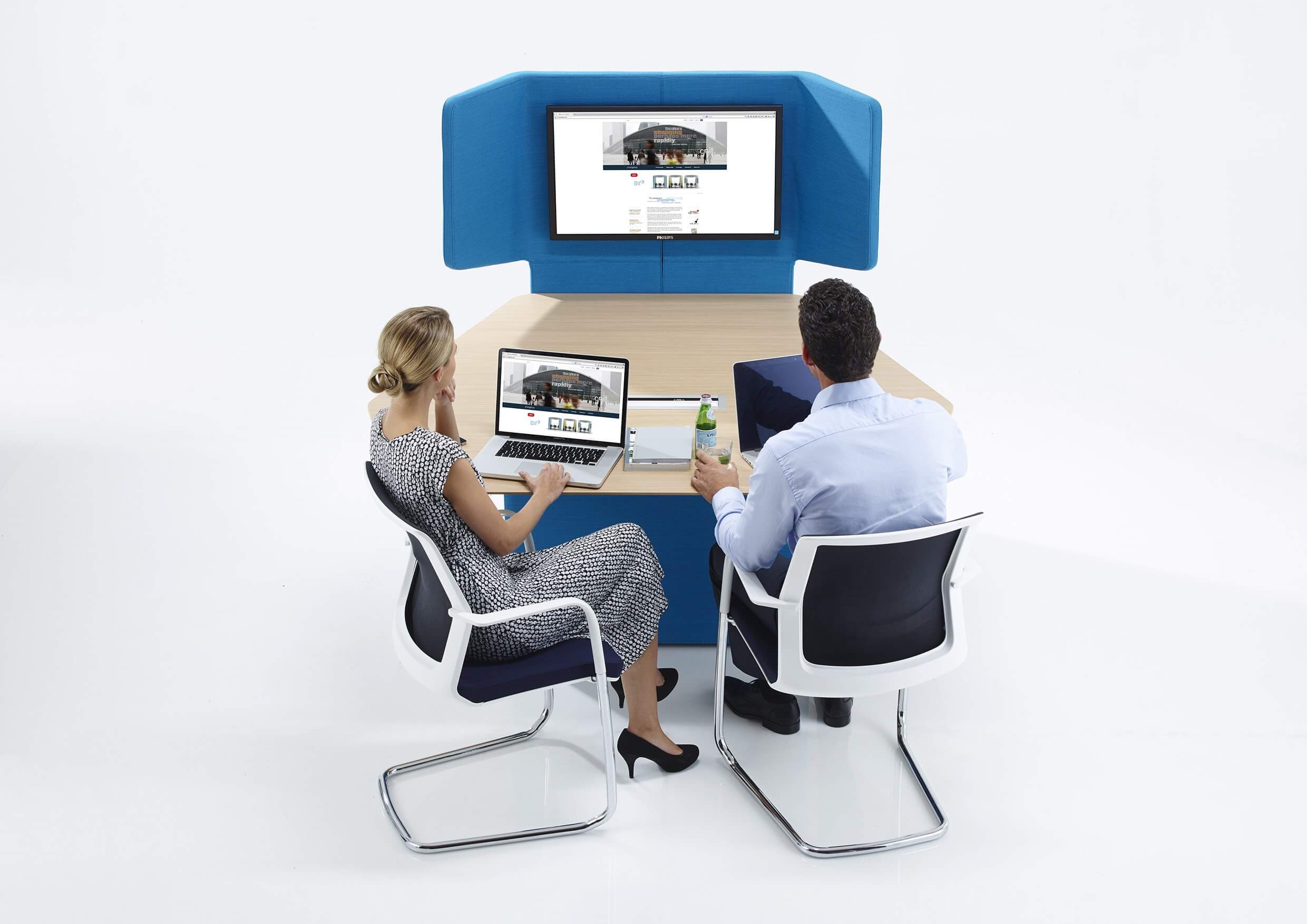 Pour assurer l’autonomie du salarié et de son « laptop », la station multimédia propose un accès de connectiques complet. Prises de courant, prises Ethernet, prises de flux vidéos … L’utilisateur pourra recharger son appareil, se connecter à l’intranet de l’entreprise, voire même partager du contenu avec les autres utilisateurs de la station grâce à la colonne dédiée à l’accueil d’un écran connecté. La station connectée est un outil de réunion des collaborateurs, elle rassemble autour d’un même espace, elle offre les connectiques pré-requises pour assurer un travail efficace. Jusqu’à 6 personnes peuvent se réunir afin d’assister à une réunion informelle et connectée, suivre une vidéo conférence sur grand écran, bénéficier d’une formation en petit comité.