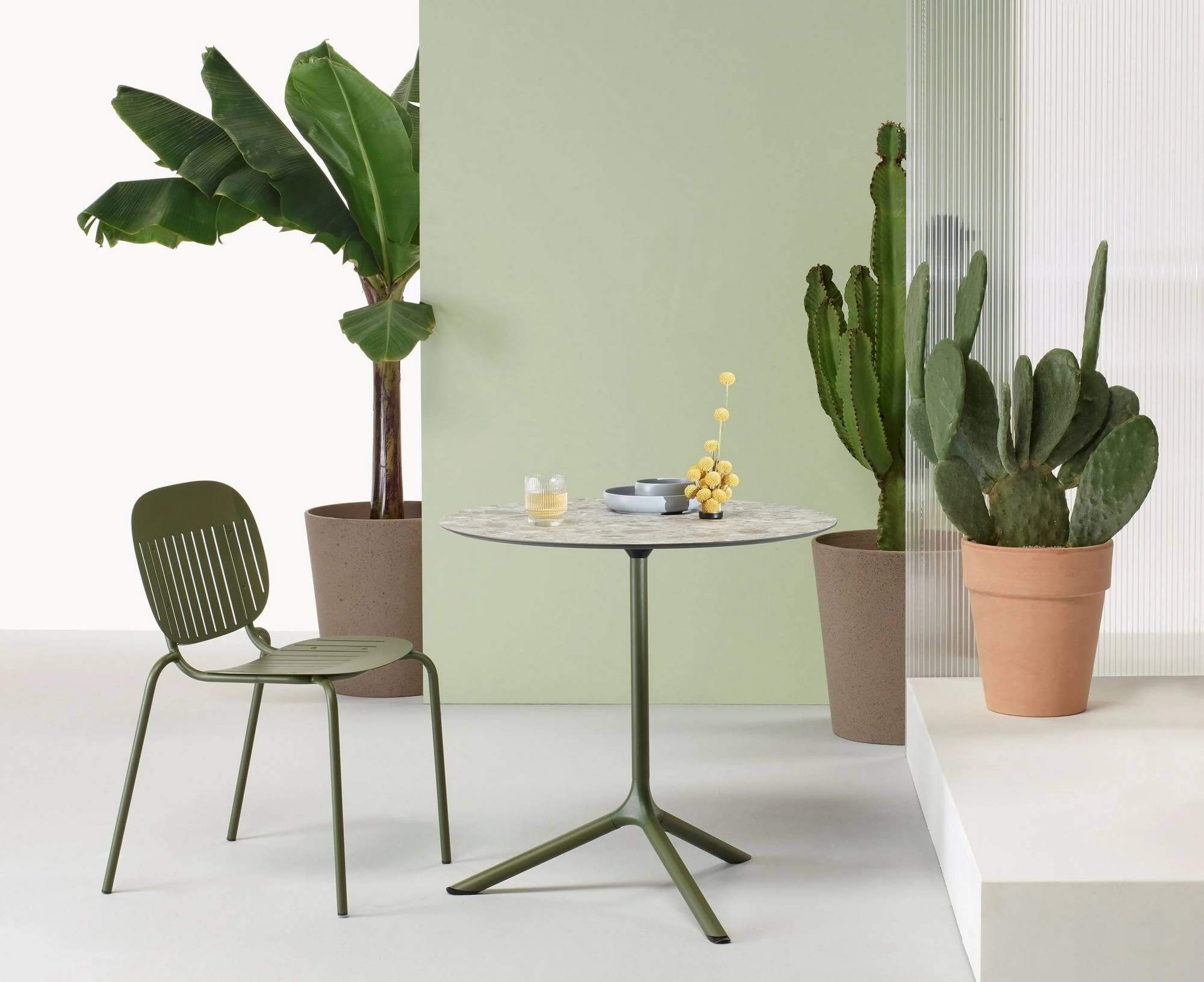 La table de terrasse TRIP offre donc un design épuré grâce à son piètement divisé en trois branches et un choix varié de textures et de coloris de plateaux, on pense au style marbre très en vogue actuellement dans le design d’intérieur ou d’extérieur notamment pour les terrasses de restaurants. Chaque table TRIP pourra opter pour un plateau qui se replie afin de répondre aux problématiques de fonctionnalité et de rangement, de la restauration en extérieur.