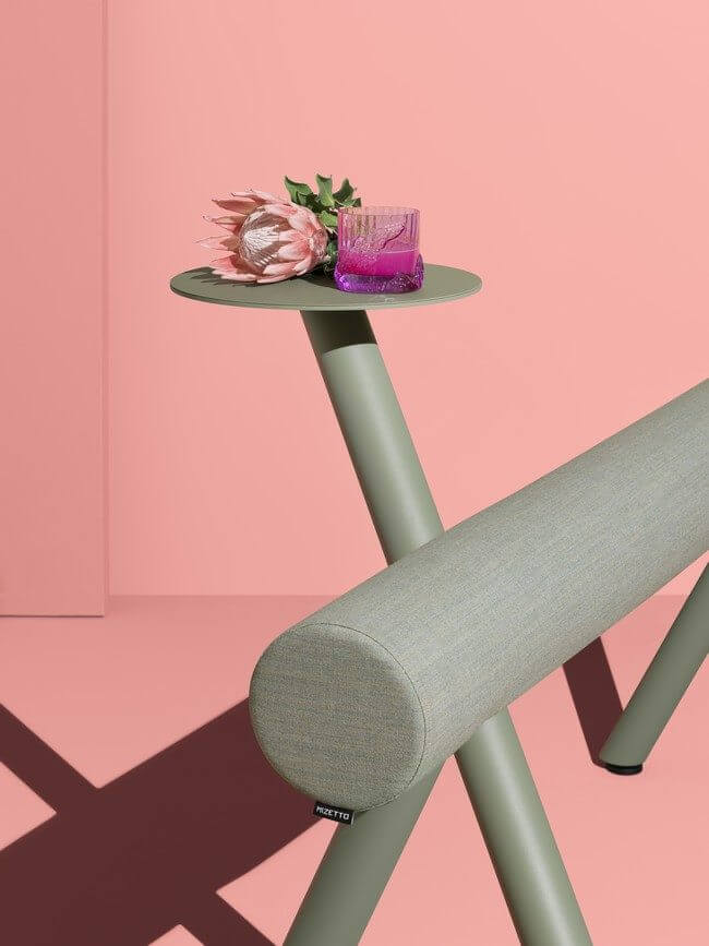 Chaque banc semble formé de structures tubulaires simples en apparence, à la manière de troncs d’arbres que l’on disposerait autour d’un feu de camp. Cette inspiration organique ouvre la voie à des usages versatiles. L’assise matelassée est suffisamment confortable pour être utilisée des deux côtés, dans une posture de « repose-fesses » informelle, ce qui permet de positionner le banc design LUMBER au centre d’un espace, sans orientation imposée.