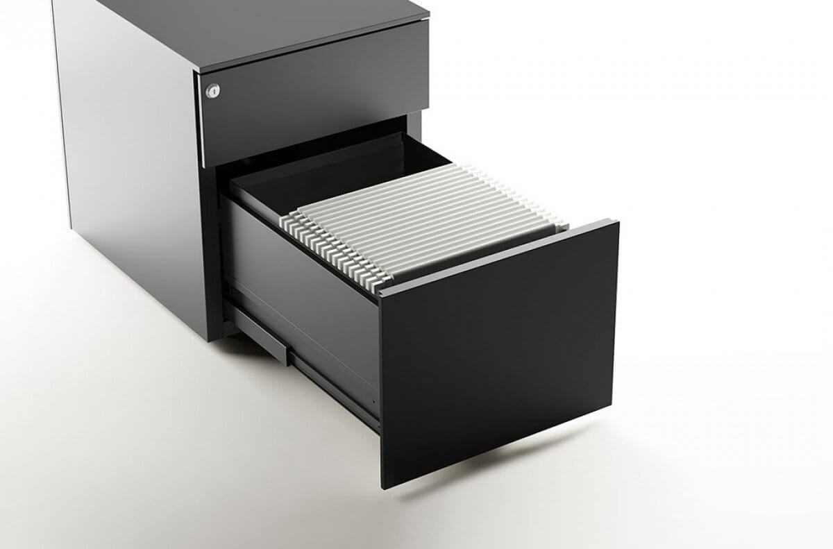 Afin d’assurer une parfaite stabilité du caisson de bureau NARROW, même à pleine charge de documents, une cinquième roulette est astucieusement disposée sous le tiroir dédié aux dossiers suspendus. L’utilisateur peut ouvrir son tiroir à glissières sans effort et sans risque de basculement. Les rails de glissement des tiroirs, fabriqués avec des matériaux de haute qualité, assurent une expérience d’utilisation intensive et durable.