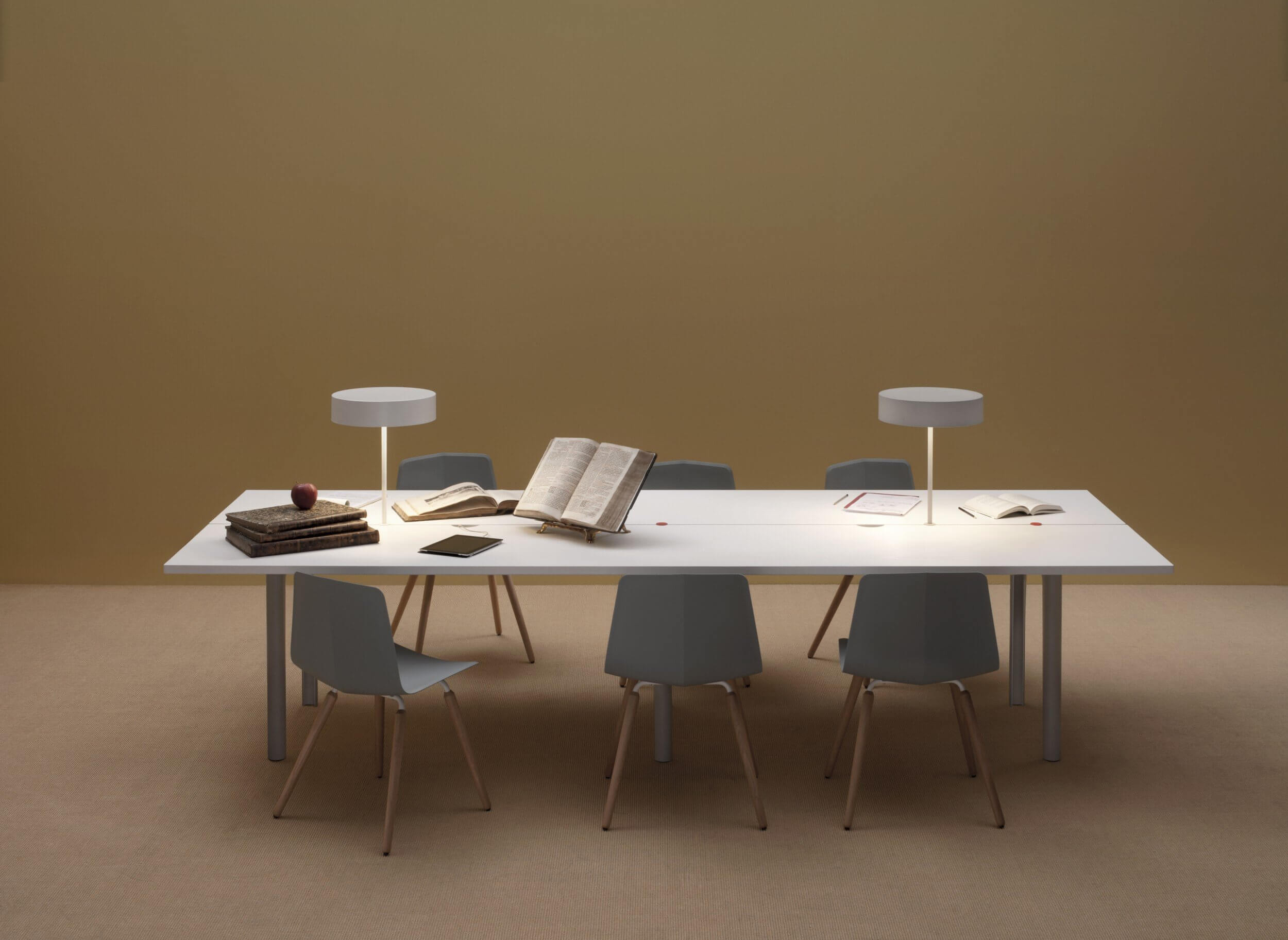 La table de réunion connectée OFF est un mobilier de bureau très polyvalent et disposant d’une forte identité esthétique. Cette table de réunion design recèle de nombreux détails à la fois fonctionnels et design permettant d’en faire un véritable outil pour le travail et pour les moments informels de la vie en entreprise. La table de réunion en bois OFF porte également une attention particulière aux équipements qui rendent l’expérience du travail plus agréable et efficace. On y retrouve pêlemêle des lampes, des blocs prises, des séparateurs design et même des éléments de rangement design qui permettent d’étendre le chant d’utilisation de cette table de réunion connectée. La forme la plus iconique et la plus captivante est la grande table de réunion avec ses lampes de lecture intégrées, superbe pour des espaces conviviaux.